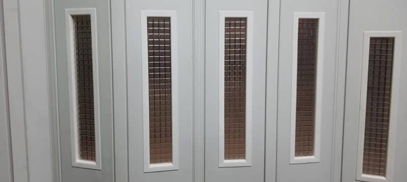 Akordiyon kapılarda kullandığımız camlar, buzlu cam görünümünde pleksiglass malzemeden üretilmiş, 5 cm x 30 cm ebadındadır.